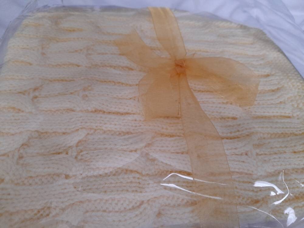 This is a baby blanket in lemon. It is wrapped in cellophane and a ribbon so would make a lovely present for a new arrival.